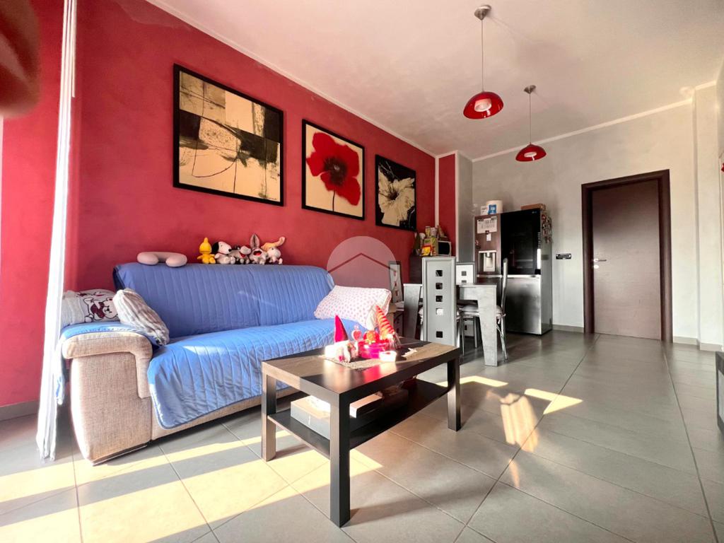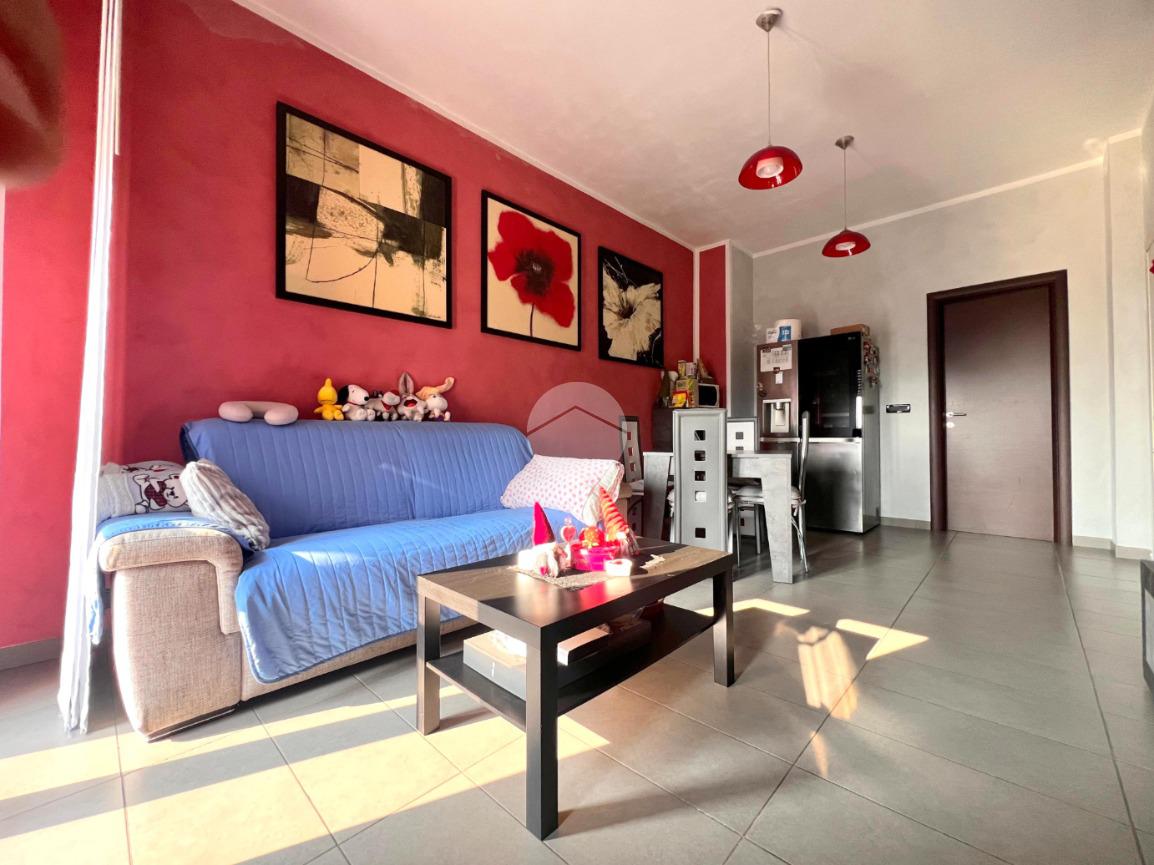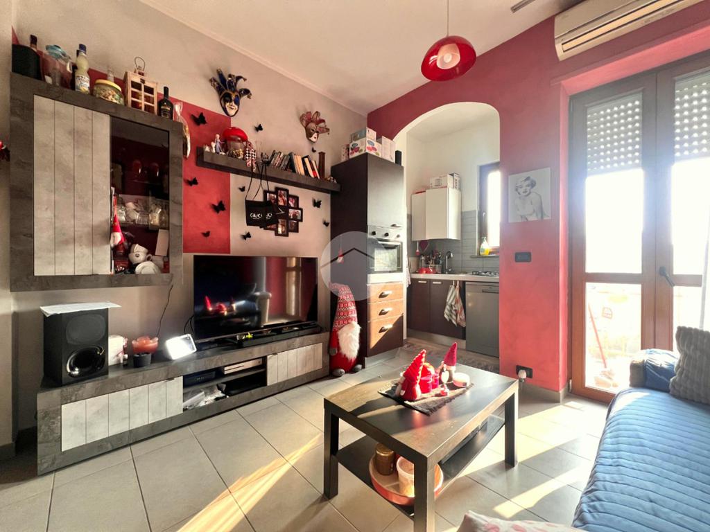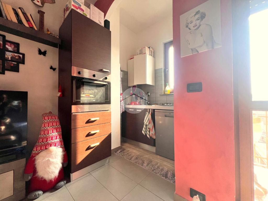Entrando si trova subito il disimpegno, a seguire il soggiorno living con la cucinotto. L'ambiente risulta molto soleggiato. Da qui si può accedere al primo balcone della soluzione.